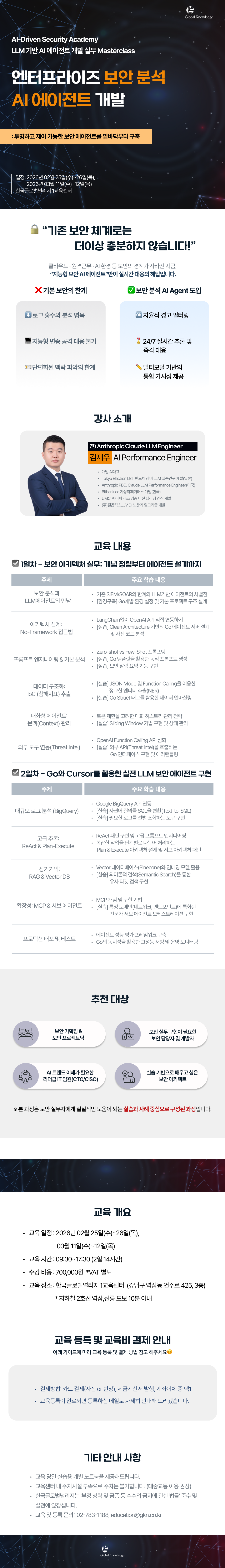 1일차: 보안 아키텍처 실무,"보안 분석과 LLM의 만남, No-Framework 기반 아키텍처 설계, 프롬프트 엔지니어링, IoC 데이터 구조화, 대화형 에이전트 문맥 관리, 외부 API(Threat Intel) 연동 실습"